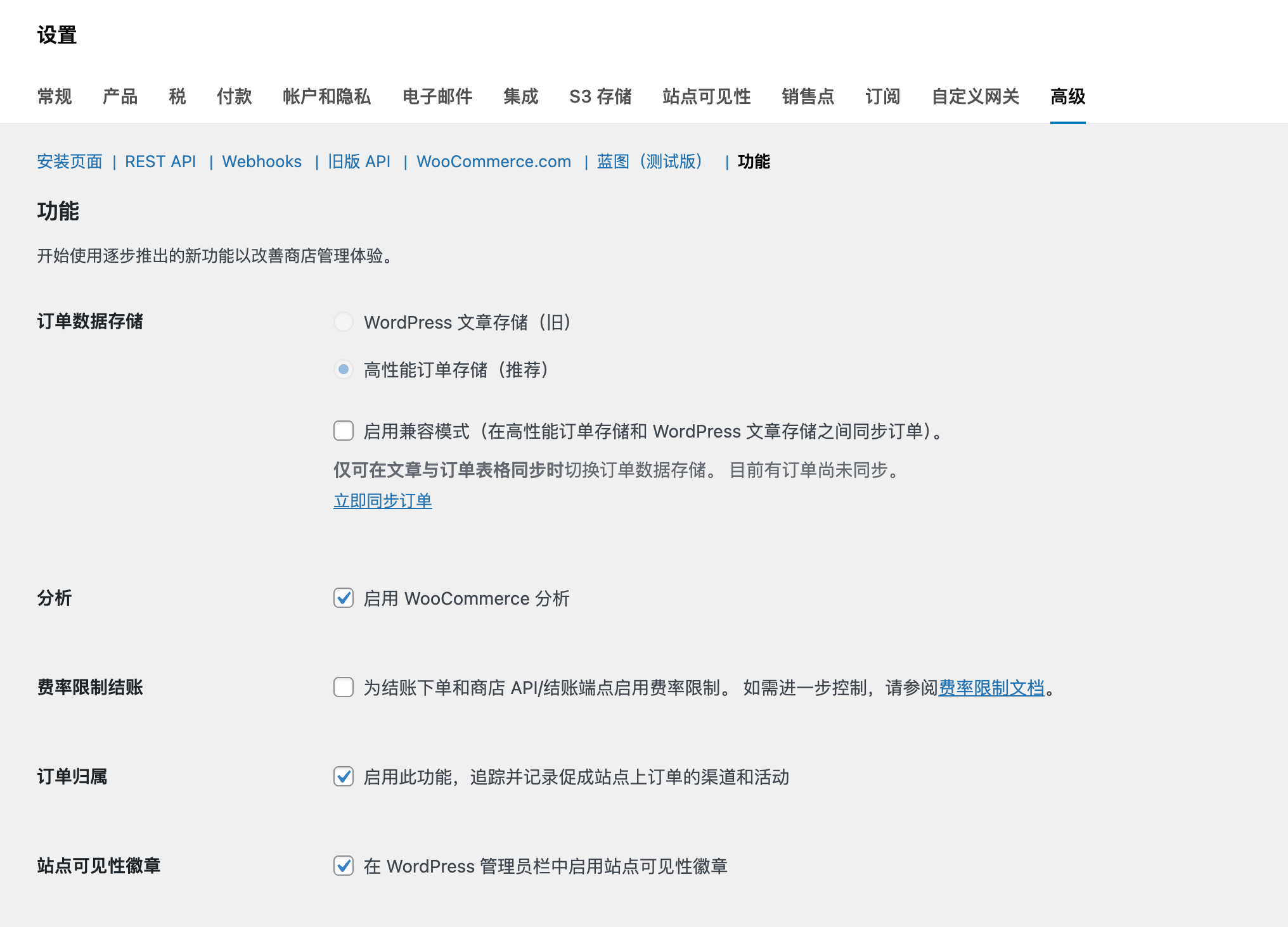 - 启用兼容模式:进入 WooCommerce → 设置 → 高级 → 功能,勾选” 启用兼容模式” 复选框并保存更改。